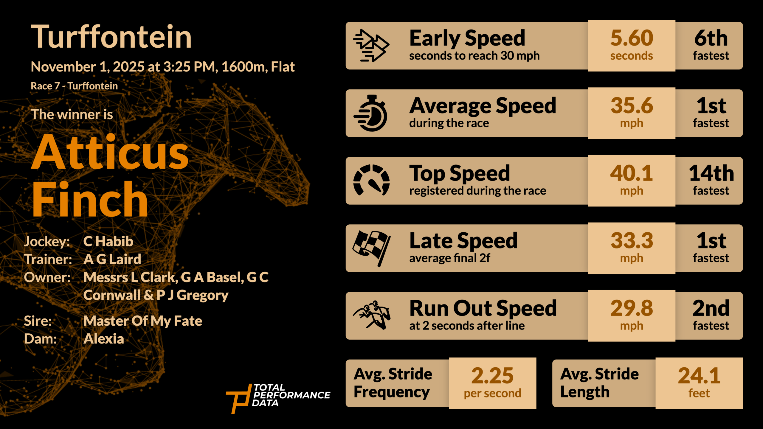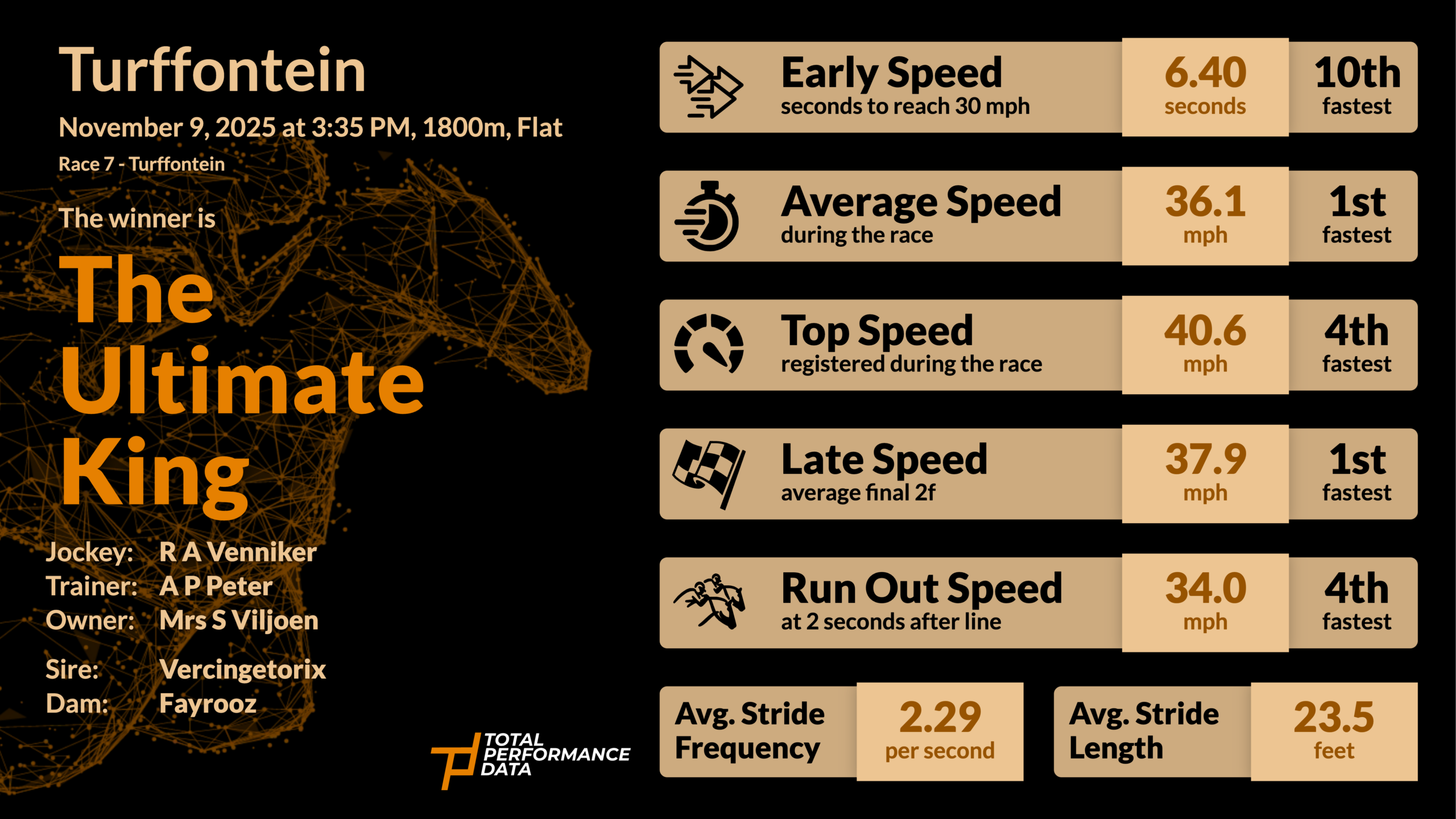 The global database of sectional times, stride data and performance metrics is available through Total Performance Data.