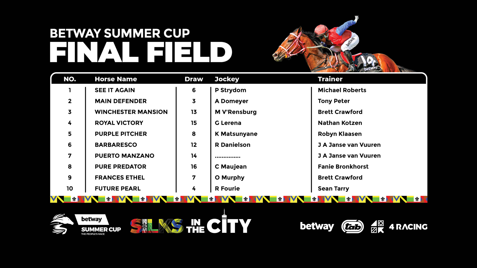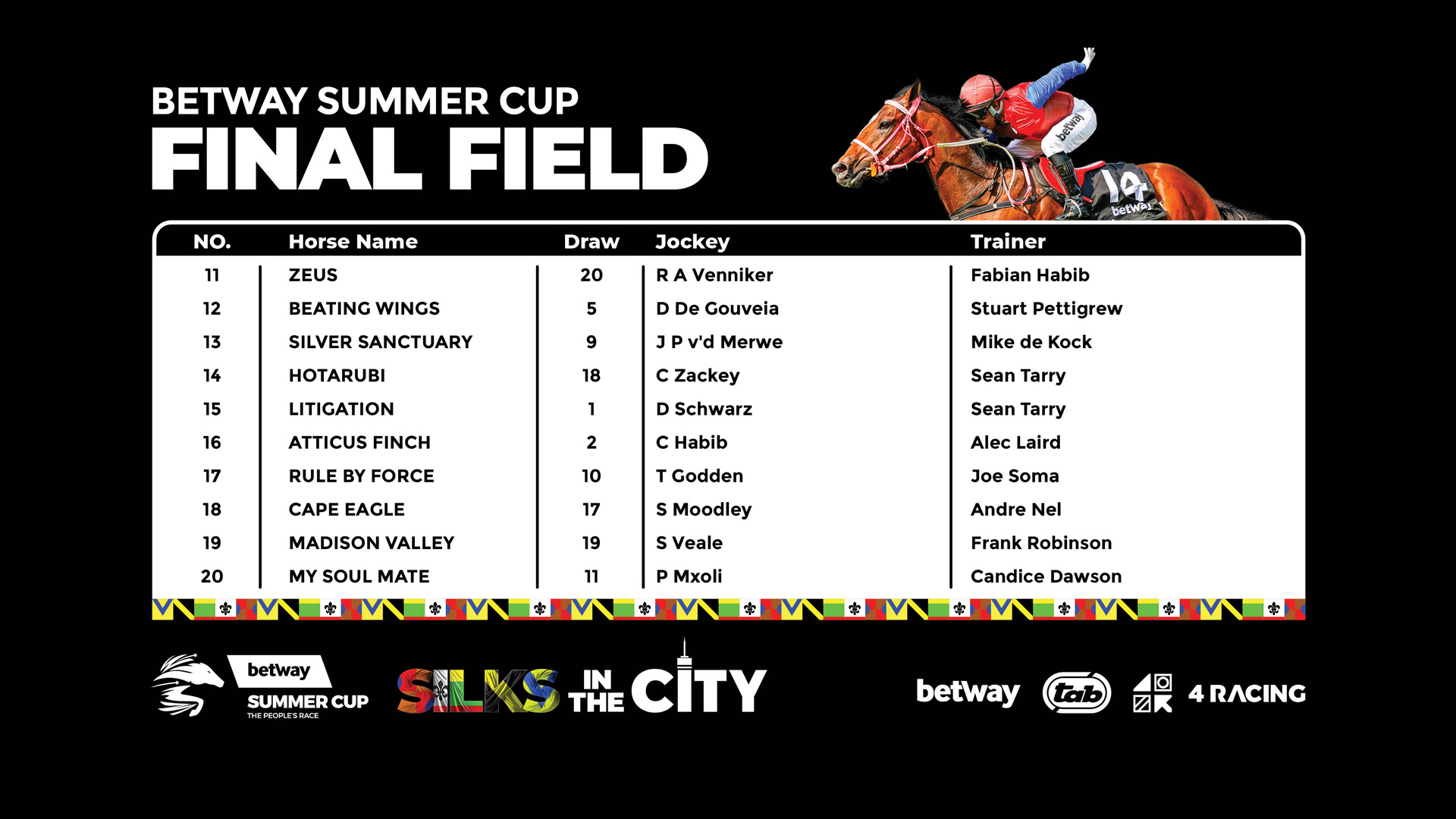 Here are the final 20 runners and barriers, as drawn for Africa’s Richest Race, the R6-million Betway Summer Cup (Grade 1):