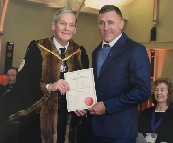 Robbie Miller (right) at a presentation ceremony for farriers, held at the Honourable Artillery Company at the headquarters of the Worshipful Company of Farriers.