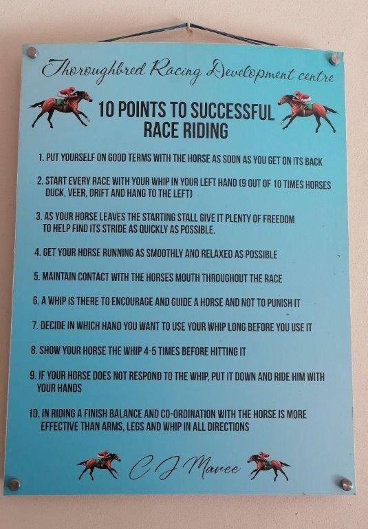 The programme was streamlined over time, emphasizing the importance of hold, balance and the correct seat. Respect for the thoroughbred, the correct approach towards a horse and personal conduct around horses, owners and trainers are the principles taught as party of the theory instruction. Maree’s “10 Points For Successful Race Riding” places emphasis on the correct use of the whip. He said: “In today’s times it is clear that people dislike the whip and I think eventually its current use will be phased out so that jockeys will only be allowed to tap their mounts on the neck. There won’t be any whipping of horses behind the saddle.”