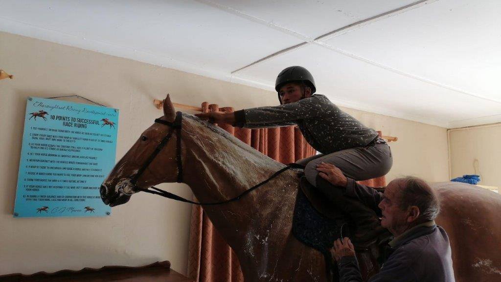 Maree, assisted by former jockeys Marthinus Mienie and Piet Nhlapo, manages an intake of up to 40 grooms, three times a year. They complete a basic course in horsemanship, a basic course in riding and an advanced course in riding. They’ve never had the use of a mechanical horse, the so-called racehorse simulator. They use a big, sturdy plastic model which Maree says is more than adequate for their needs. “When the riders are ready, we put them on real horses. We make a video of each ride and then we study the videos together so we can correct faults.”