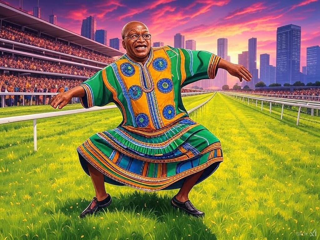 In the interest of inclusivity and nation-building, Gold Circle appoints a Zulu race caller for the 2025 Durban July. Umgeni Mayor, Chris Pappas, gives a welcoming address in Zulu. The MK Party’s Jacob Zuma dances for the capacity crowd to the tune of ‘Umshini Wami’ and invites everyone to sing along. Veteran racing scribe, Andrew Harrison, launches himself from the media bench on the top floor of the grandstand, and into the crowd.