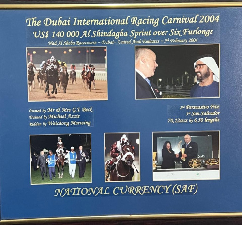 Azzie flew from Dubai to Cape Town and, the following evening, presented the trophy to Graham and Mrs Rhona Beck at their Clifton home. They were on cloud nine and discussed their horse’s future. Sheikh Mohammed, the Ruler of Dubai, had made an offer of R21-million to buy National Currency for Godolphin before Dubai World Cup Night, where the Group 1 Golden Shaheen had become his Carnival mission. Mr Beck turned this offer down, too.