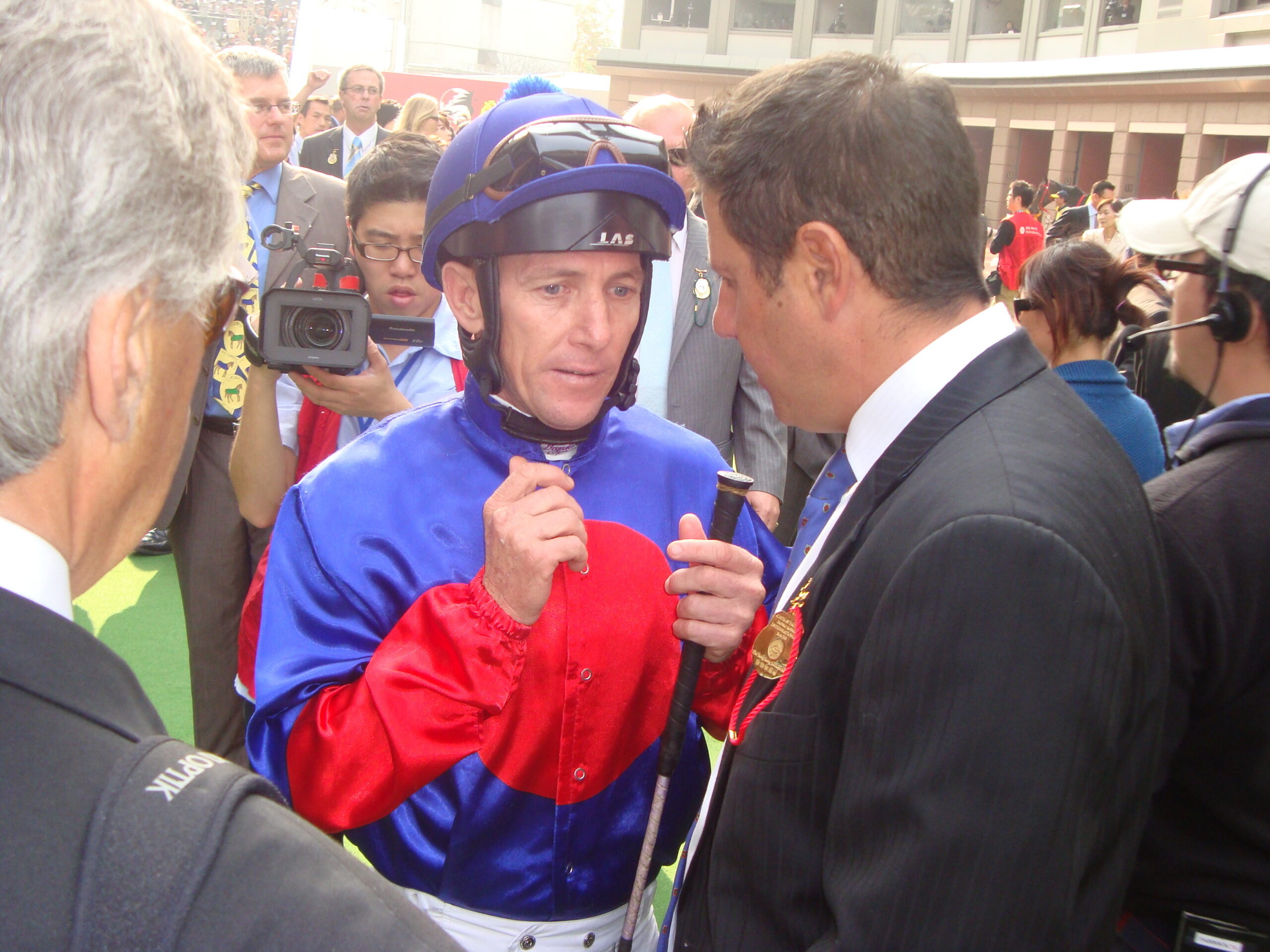 Above: Media attention in the saddling enclosure at Sha Tin, Sean Tarry with owner Chris van Niekerk and jockey Kevin Shea (photo: supplied)